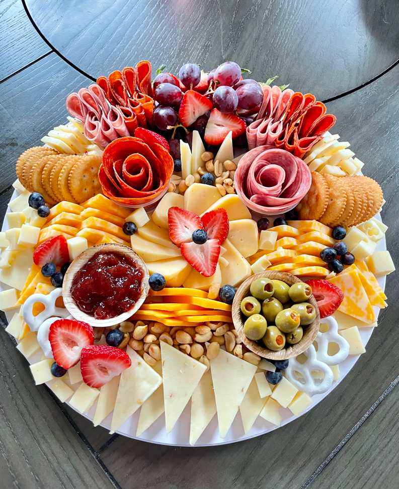Our personalized charcuterie boards are perfect to share with friends and family, they include varieties of cheeses, cured meats, fresh fruits, crackers, pretzels, honey, preserves fruits, olives, nuts, we have a variety of sizes that you can choose according to the amount of guests you have!