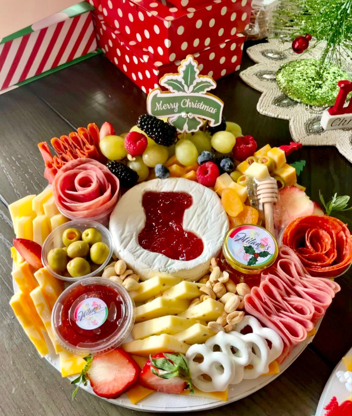 Our personalized charcuterie boards are perfect to share with friends and family, they include varieties of cheeses, cured meats, fresh fruits, crackers, pretzels, honey, preserves fruits, olives, nuts, we have a variety of sizes that you can choose according to the amount of guests you have!